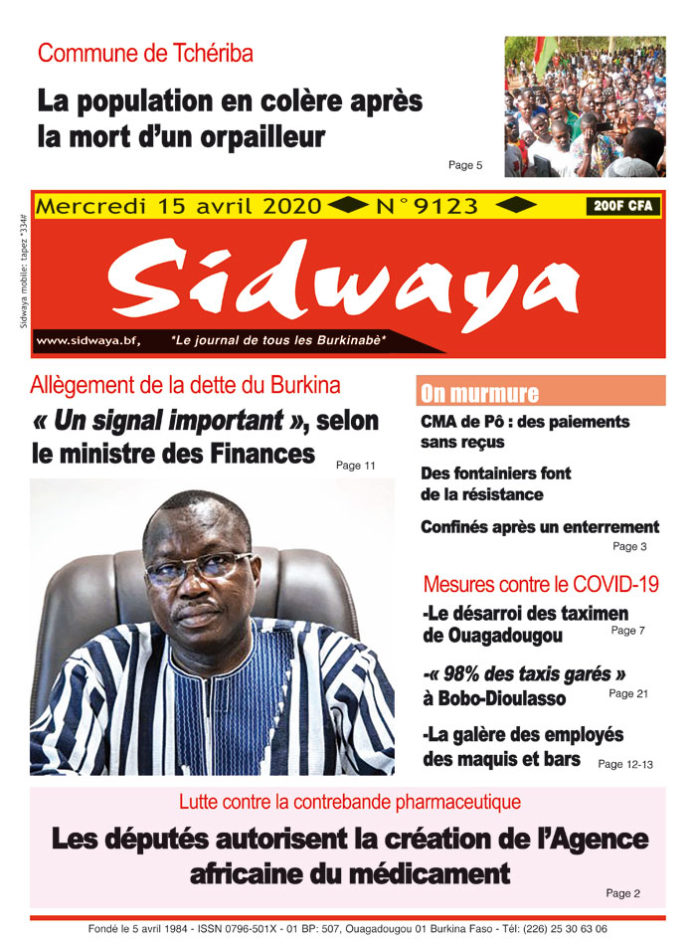 SIDWAYA QUOTIDIEN Une Sidwaya du 15 avril 2020 Par JK. Sidwaya - 15 avril 2020 FacebookTwitterPinterestWhatsAppLinkedinE-mailImprimerTumblrTelegramViberNaver