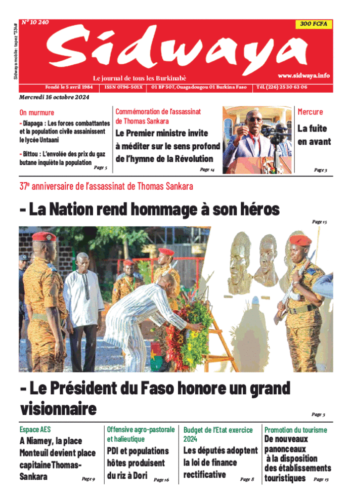 SIDWAYA QUOTIDIEN Une Sidwaya du 16-10-2024 Par JK. Sidwaya - 15 octobre 2024 FacebookTwitterPinterestWhatsAppLinkedinE-mailImprimerTumblrTelegramViberNaver