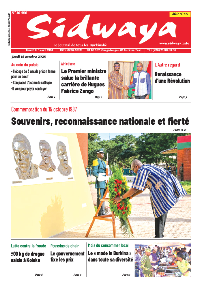 SIDWAYA QUOTIDIEN Une Sidwaya du 16-10-2025 Par JK. Sidwaya - 15 octobre 2025 FacebookTwitterPinterestWhatsAppLinkedinE-mailImprimerTumblrTelegramViberNaver