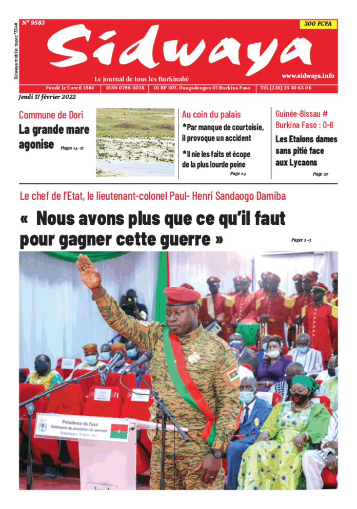 SIDWAYA QUOTIDIEN Une Sidwaya du 17-2022 Par JK. Sidwaya - 17 février 2022 FacebookTwitterPinterestWhatsAppLinkedinE-mailImprimerTumblrTelegramViberNaver