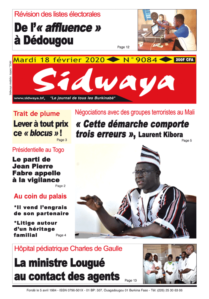 SIDWAYA QUOTIDIEN Une sidwaya du 18 02 2020 Par JK. Sidwaya - 17 février 2020 FacebookTwitterPinterestWhatsAppLinkedinE-mailImprimerTumblrTelegramViberNaver