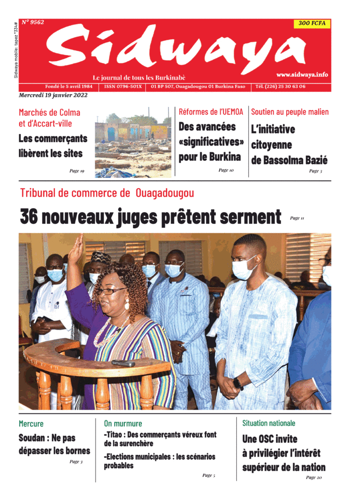 SIDWAYA QUOTIDIEN Une Sidwaya du 19-01-2022 Par JK. Sidwaya - 18 janvier 2022 FacebookTwitterPinterestWhatsAppLinkedinE-mailImprimerTumblrTelegramViberNaver