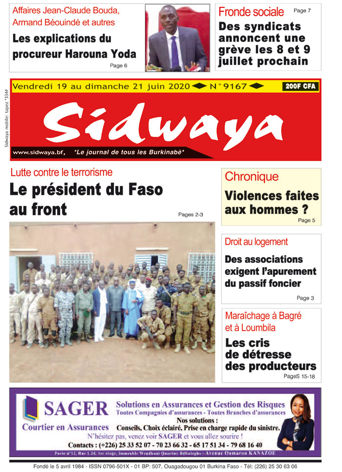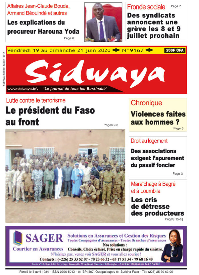 SIDWAYA QUOTIDIEN Une Sidwaya du 19 au 21 juin 2020 Par JK. Sidwaya - 18 juin 2020 FacebookTwitterPinterestWhatsAppLinkedinE-mailImprimerTumblrTelegramViberNaver