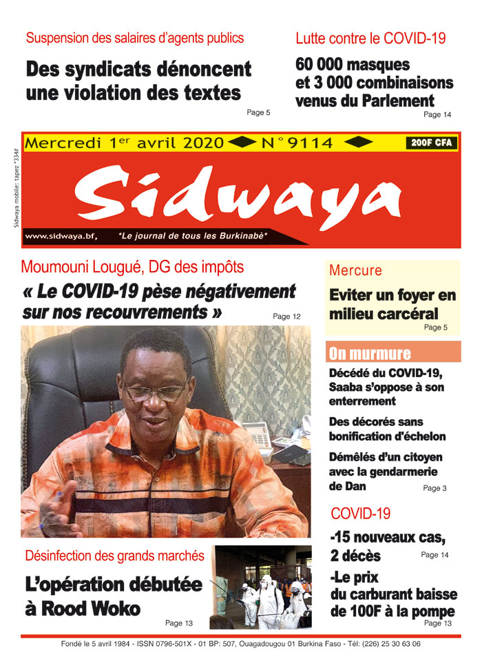 SIDWAYA QUOTIDIEN Une Sidwaya du 1er avril 2020 Par JK. Sidwaya - 1 avril 2020 FacebookTwitterPinterestWhatsAppLinkedinE-mailImprimerTumblrTelegramViberNaver