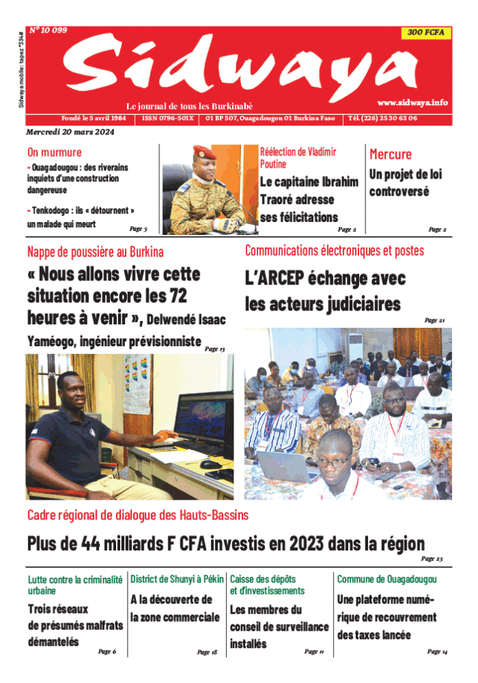 SIDWAYA QUOTIDIENSPORT Une Sidwaya du 20-03-2024 Par JK. Sidwaya - 20 mars 2024 FacebookTwitterPinterestWhatsAppLinkedinE-mailImprimerTumblrTelegramViberNaver
