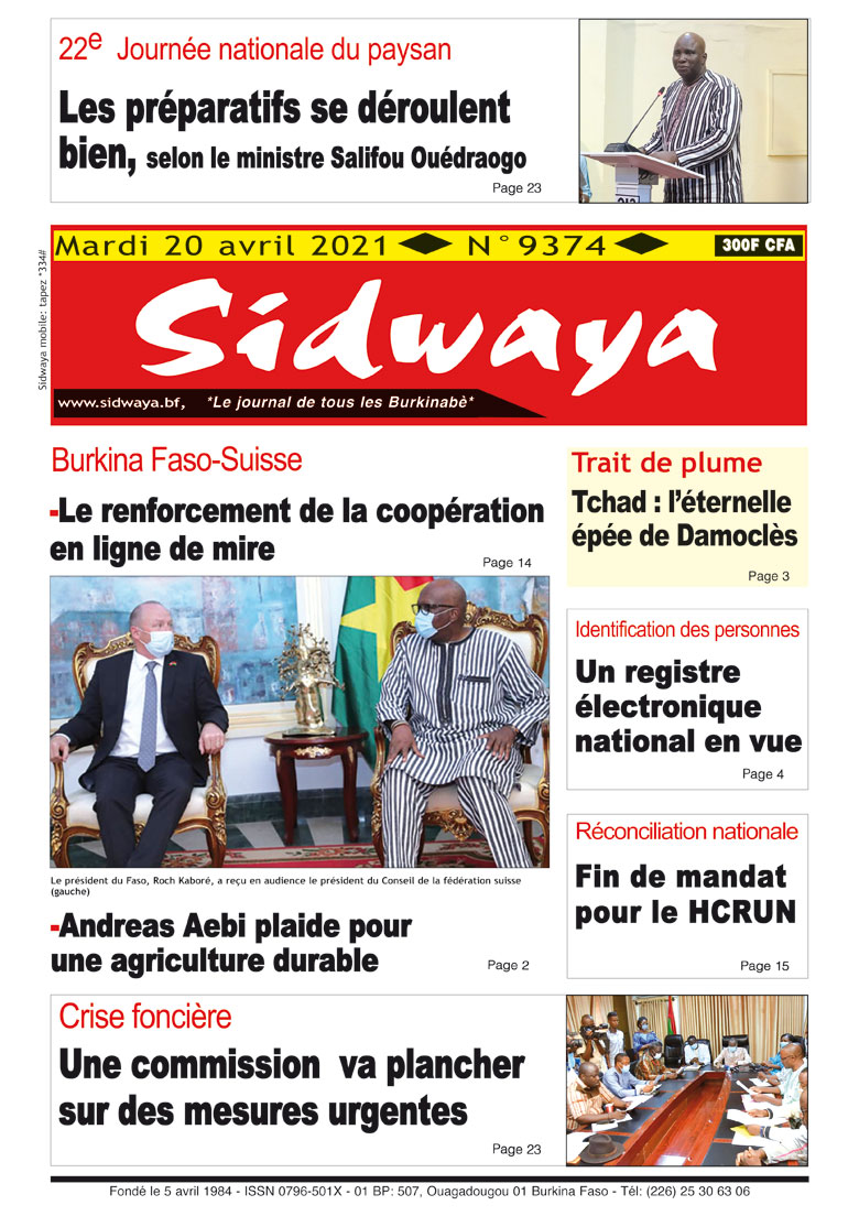 SIDWAYA QUOTIDIEN Une Sidwaya du 20-04-2021 Par JK. Sidwaya - 19 avril 2021 FacebookTwitterPinterestWhatsAppLinkedinE-mailImprimerTumblrTelegramViberNaver