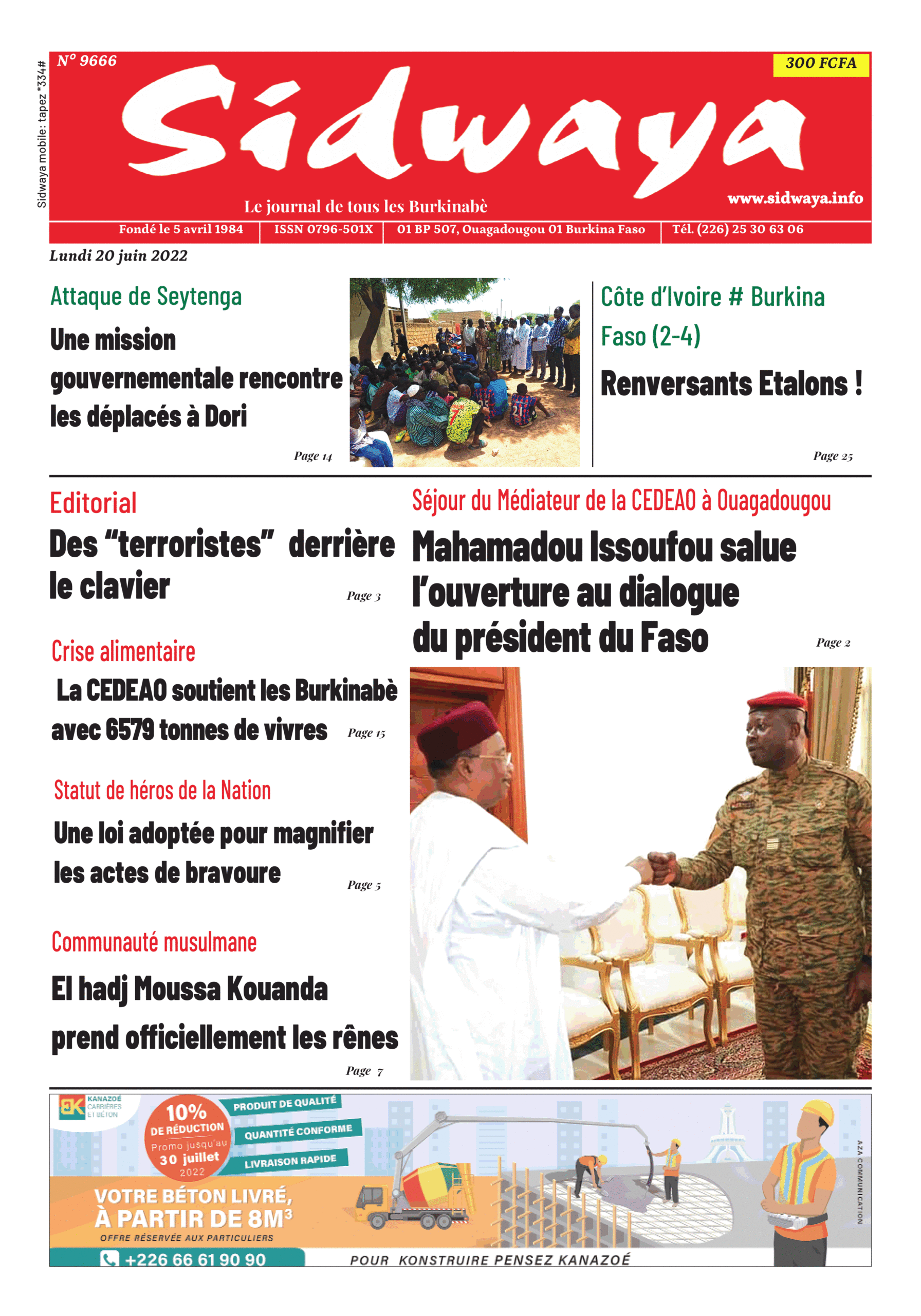 SIDWAYA QUOTIDIEN Une Sidwaya du 20-06-2022 Par JK. Sidwaya - 19 juin 2022 FacebookTwitterPinterestWhatsAppLinkedinE-mailImprimerTumblrTelegramViberNaver