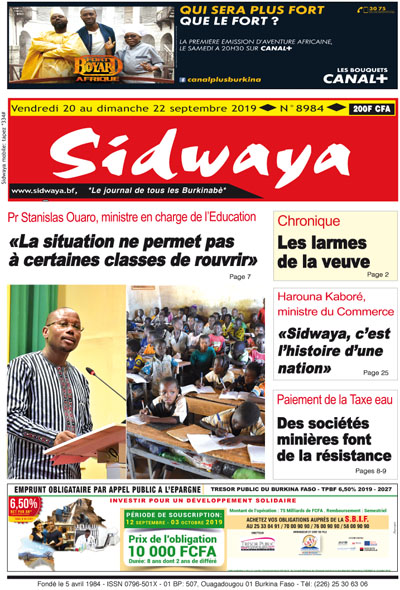 SIDWAYA QUOTIDIEN Une sidwaya du 20 09 2019 Par JK. Sidwaya - 20 septembre 2019 FacebookTwitterPinterestWhatsAppLinkedinE-mailImprimerTumblrTelegramViberNaver