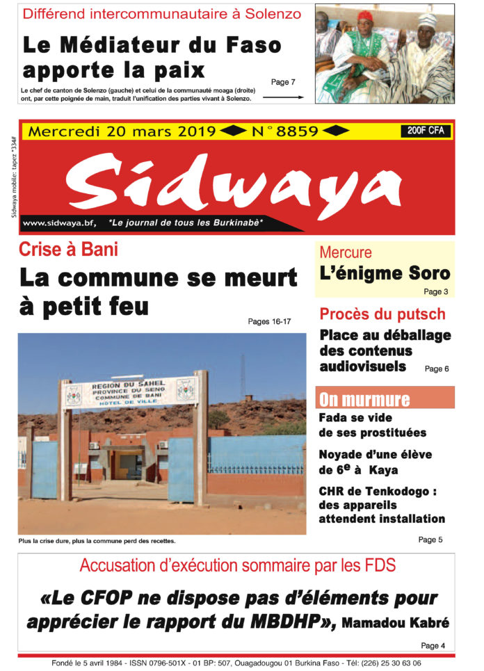 SIDWAYA QUOTIDIEN Une Sidwaya du 20 30 2019 Par BM. Sidwaya - 19 mars 2019 FacebookTwitterPinterestWhatsAppLinkedinE-mailImprimerTumblrTelegramViberNaver