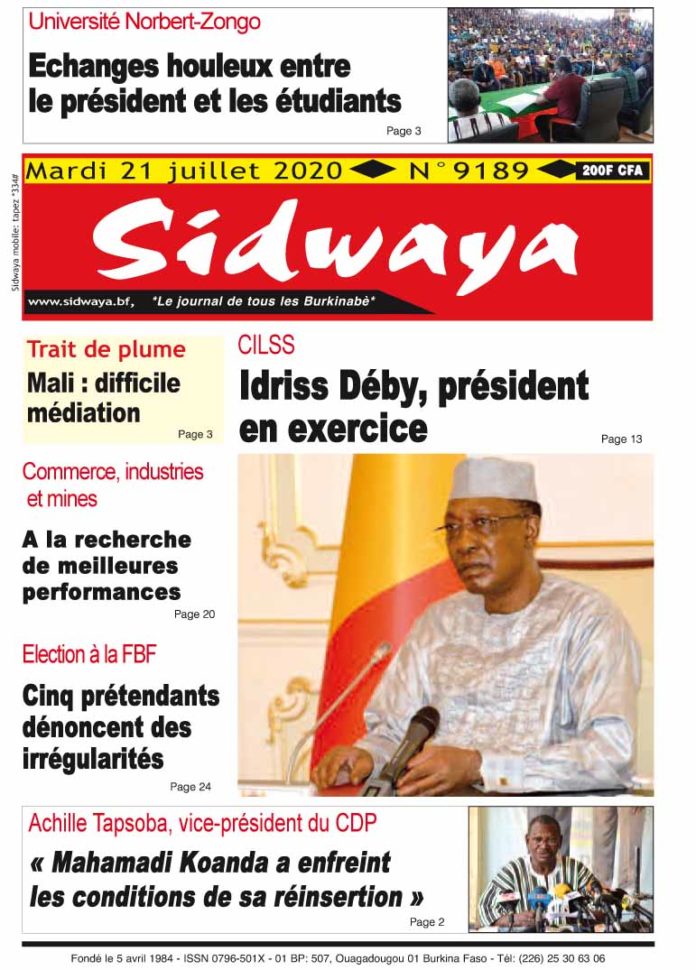 SIDWAYA QUOTIDIEN Une Sidwaya du 21-07-2020 Par DD. Sidwaya - 20 juillet 2020 FacebookTwitterPinterestWhatsAppLinkedinE-mailImprimerTumblrTelegramViberNaver