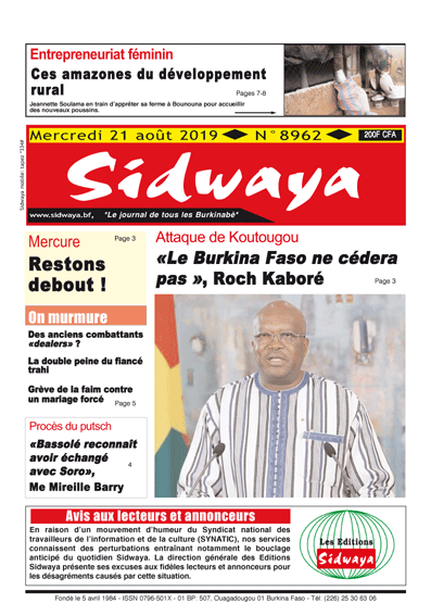 SIDWAYA QUOTIDIEN Une Sidwaya du 21 08 2019 Par BM. Sidwaya - 21 août 2019 FacebookTwitterPinterestWhatsAppLinkedinE-mailImprimerTumblrTelegramViberNaver