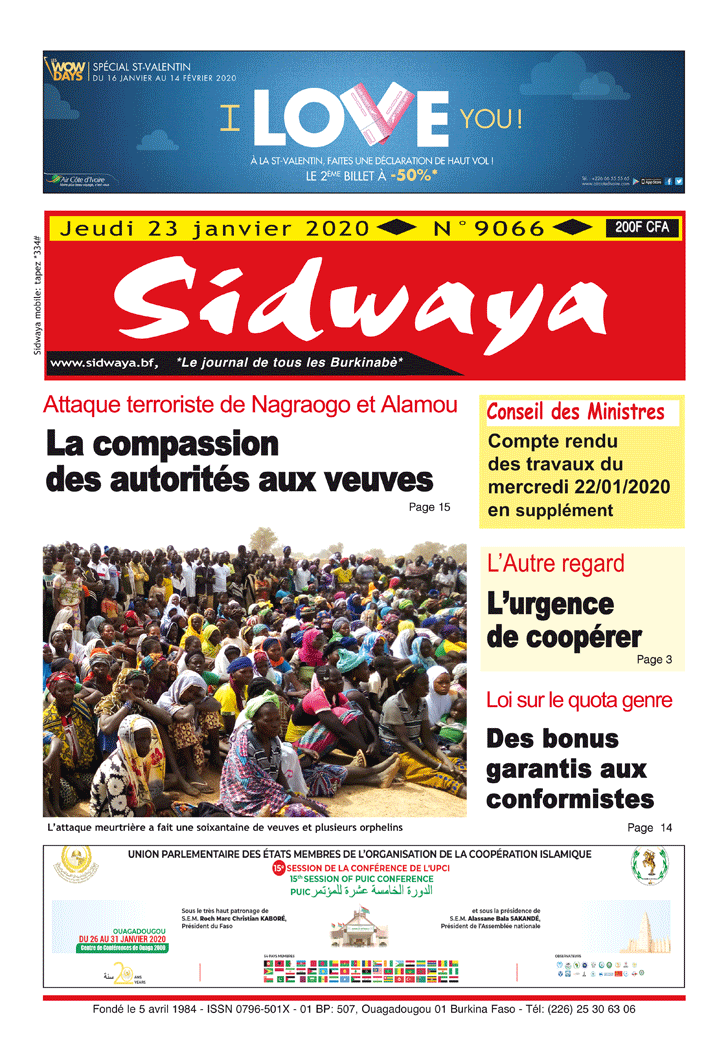 SIDWAYA QUOTIDIEN Une sidwaya du 23 01 2020 Par BM. Sidwaya - 22 janvier 2020 FacebookTwitterPinterestWhatsAppLinkedinE-mailImprimerTumblrTelegramViberNaver