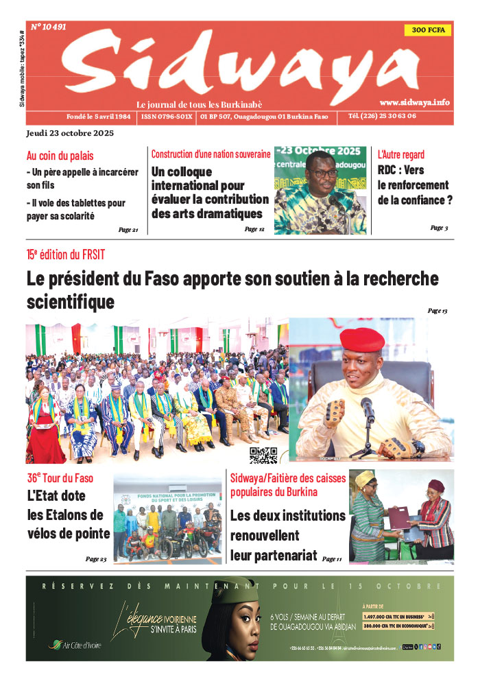 SIDWAYA QUOTIDIEN Une Sidwaya du 23-10-2025 Par JK. Sidwaya - 22 octobre 2025 FacebookTwitterPinterestWhatsAppLinkedinE-mailImprimerTumblrTelegramViberNaver