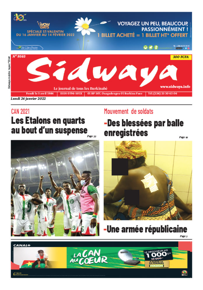 SIDWAYA QUOTIDIEN Une Sidwaya du 24/01/2022 Par JK. Sidwaya - 24 janvier 2022 FacebookTwitterPinterestWhatsAppLinkedinE-mailImprimerTumblrTelegramViberNaver