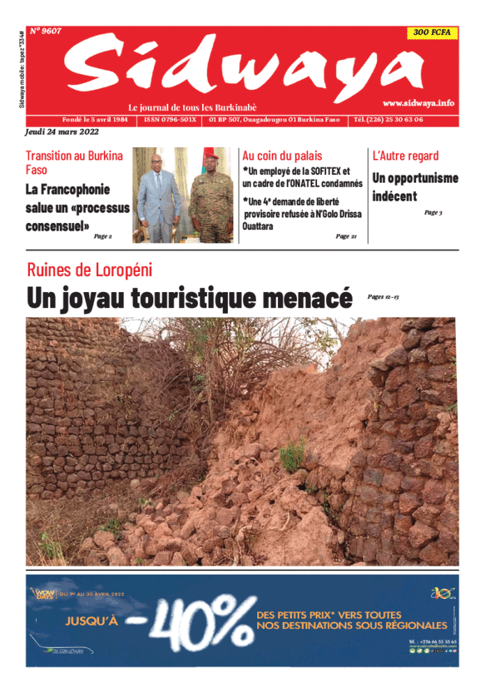 SIDWAYA QUOTIDIEN Une Sidwaya du 24-03-2022 Par JK. Sidwaya - 23 mars 2022 FacebookTwitterPinterestWhatsAppLinkedinE-mailImprimerTumblrTelegramViberNaver
