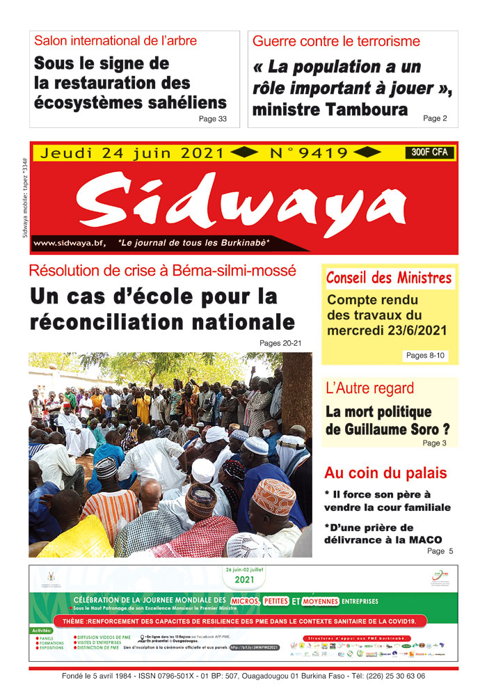SIDWAYA QUOTIDIEN Une Sidwaya du 24-06-2021 Par JK. Sidwaya - 23 juin 2021 FacebookTwitterPinterestWhatsAppLinkedinE-mailImprimerTumblrTelegramViberNaver