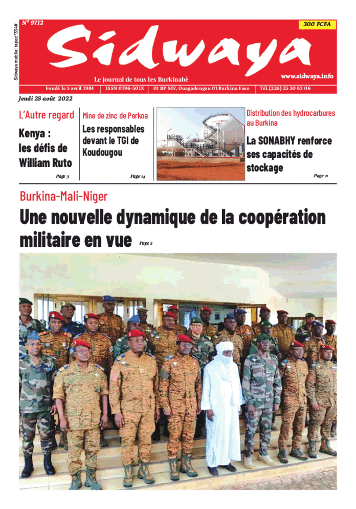 SIDWAYA QUOTIDIEN Une Sidwaya du 25-08-2022 Par JK. Sidwaya - 24 août 2022 FacebookTwitterPinterestWhatsAppLinkedinE-mailImprimerTumblrTelegramViberNaver