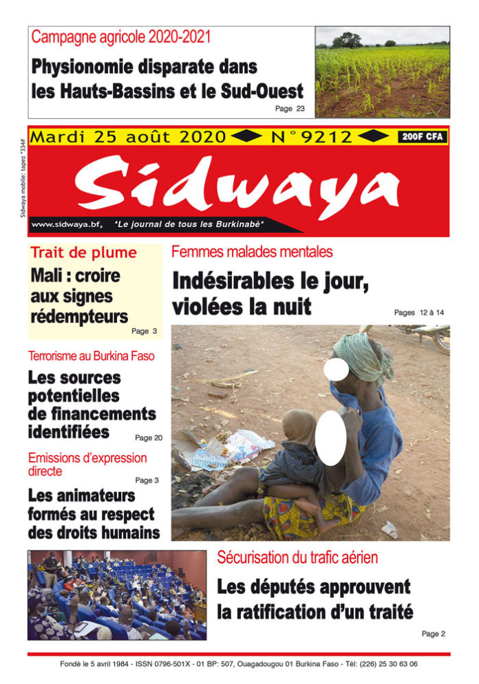 SIDWAYA QUOTIDIEN Une Sidwaya du 25 août 2020 Par JK. Sidwaya - 24 août 2020 FacebookTwitterPinterestWhatsAppLinkedinE-mailImprimerTumblrTelegramViberNaver