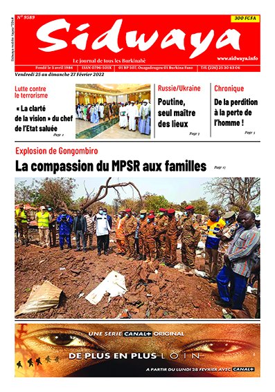 SIDWAYA QUOTIDIEN Une Sidwaya du 25 au 27-02-2022 Par JK. Sidwaya - 24 février 2022 FacebookTwitterPinterestWhatsAppLinkedinE-mailImprimerTumblrTelegramViberNaver