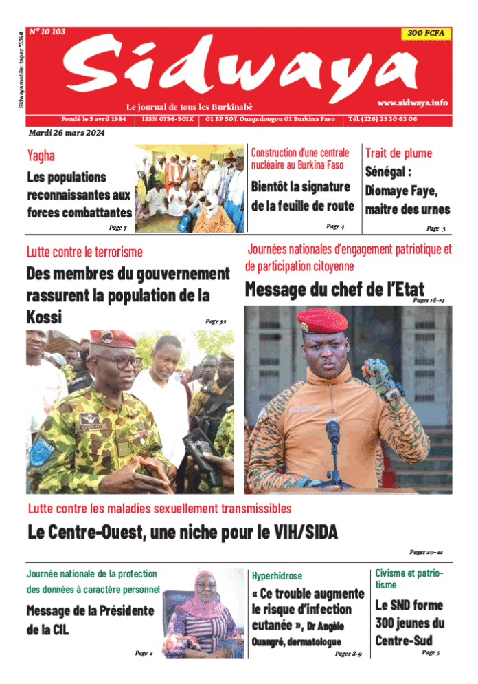 SIDWAYA QUOTIDIEN Une Sidwaya du 26-03-2024 Par JK. Sidwaya - 25 mars 2024 FacebookTwitterPinterestWhatsAppLinkedinE-mailImprimerTumblrTelegramViberNaver
