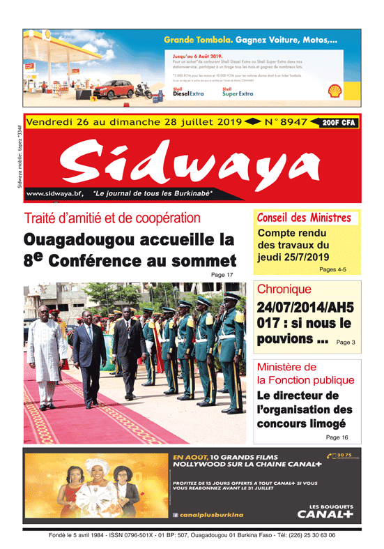 SIDWAYA QUOTIDIEN Une sidwaya du 26 07 2019 Par BM. Sidwaya - 26 juillet 2019 FacebookTwitterPinterestWhatsAppLinkedinE-mailImprimerTumblrTelegramViberNaver