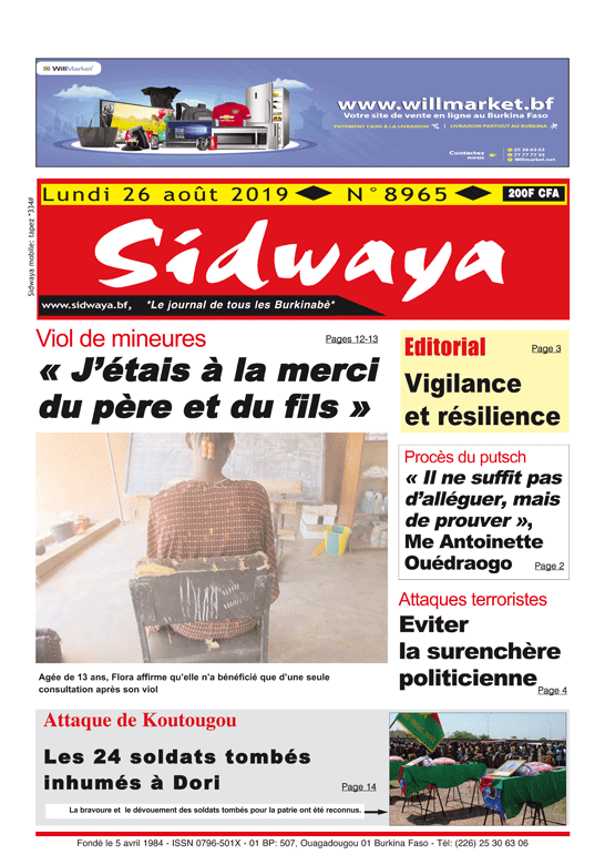 SIDWAYA QUOTIDIEN Une Sidwaya du 26 08 2019 Par BM. Sidwaya - 26 août 2019 FacebookTwitterPinterestWhatsAppLinkedinE-mailImprimerTumblrTelegramViberNaver