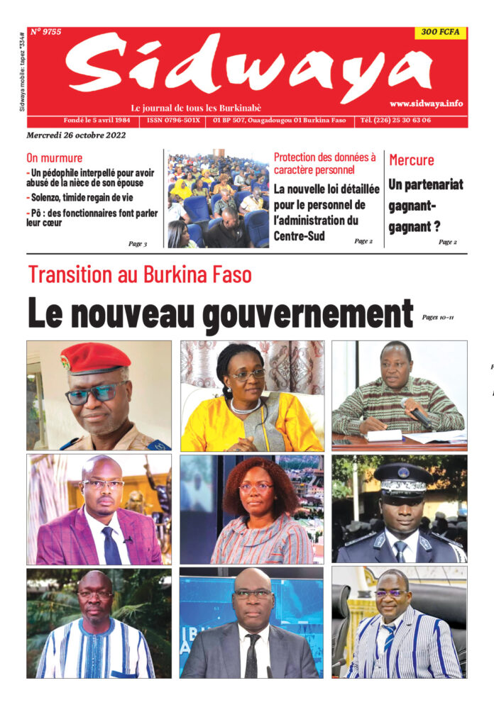 SIDWAYA QUOTIDIEN Une Sidwaya du 26/10/2022 Par JK. Sidwaya - 26 octobre 2022 FacebookTwitterPinterestWhatsAppLinkedinE-mailImprimerTumblrTelegramViberNaver