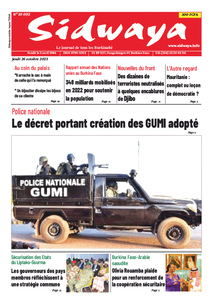 SIDWAYA QUOTIDIEN Une Sidwaya du 26-10-2023 Par JK. Sidwaya - 25 octobre 2023 FacebookTwitterPinterestWhatsAppLinkedinE-mailImprimerTumblrTelegramViberNaver