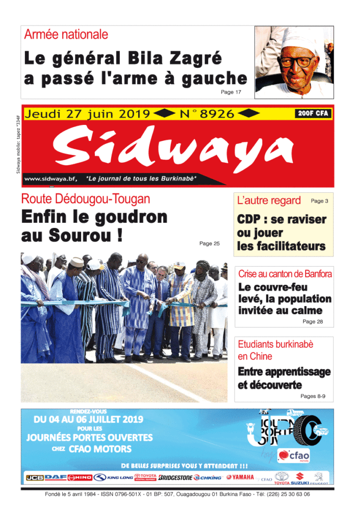 SIDWAYA QUOTIDIEN Une sidwaya du 27 06 2019 Par BM. Sidwaya - 26 juin 2019 FacebookTwitterPinterestWhatsAppLinkedinE-mailImprimerTumblrTelegramViberNaver