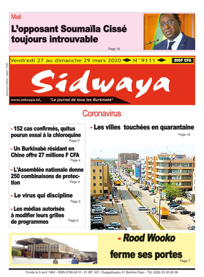SIDWAYA QUOTIDIEN Une Sidwaya du 27 mars 2020 Par JK. Sidwaya - 27 mars 2020 FacebookTwitterPinterestWhatsAppLinkedinE-mailImprimerTumblrTelegramViberNaver