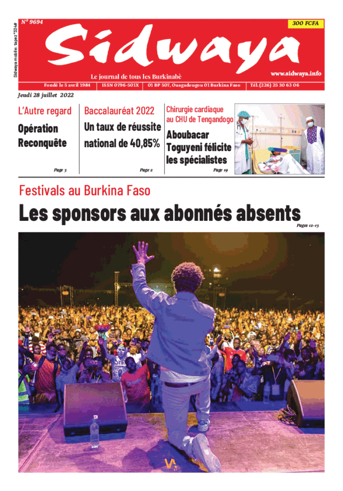 SIDWAYA QUOTIDIEN Une Sidwaya du 28-07-2022 Par JK. Sidwaya - 28 juillet 2022 FacebookTwitterPinterestWhatsAppLinkedinE-mailImprimerTumblrTelegramViberNaver