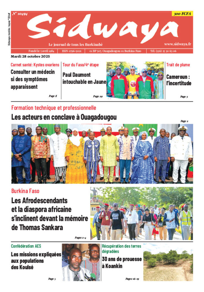 SIDWAYA QUOTIDIEN Une Sidwaya du 28-10-2025 Par JK. Sidwaya - 27 octobre 2025 FacebookTwitterPinterestWhatsAppLinkedinE-mailImprimerTumblrTelegramViberNaver