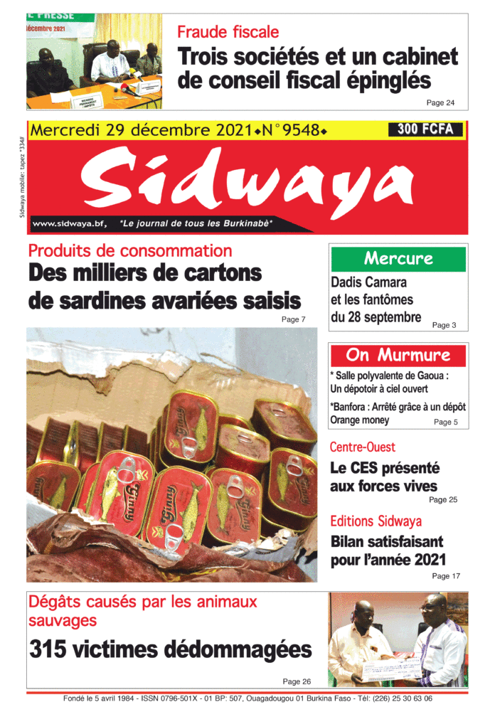 SIDWAYA QUOTIDIEN Une Sidwaya du 29-12-2021 Par JK. Sidwaya - 28 décembre 2021 FacebookTwitterPinterestWhatsAppLinkedinE-mailImprimerTumblrTelegramViberNaver
