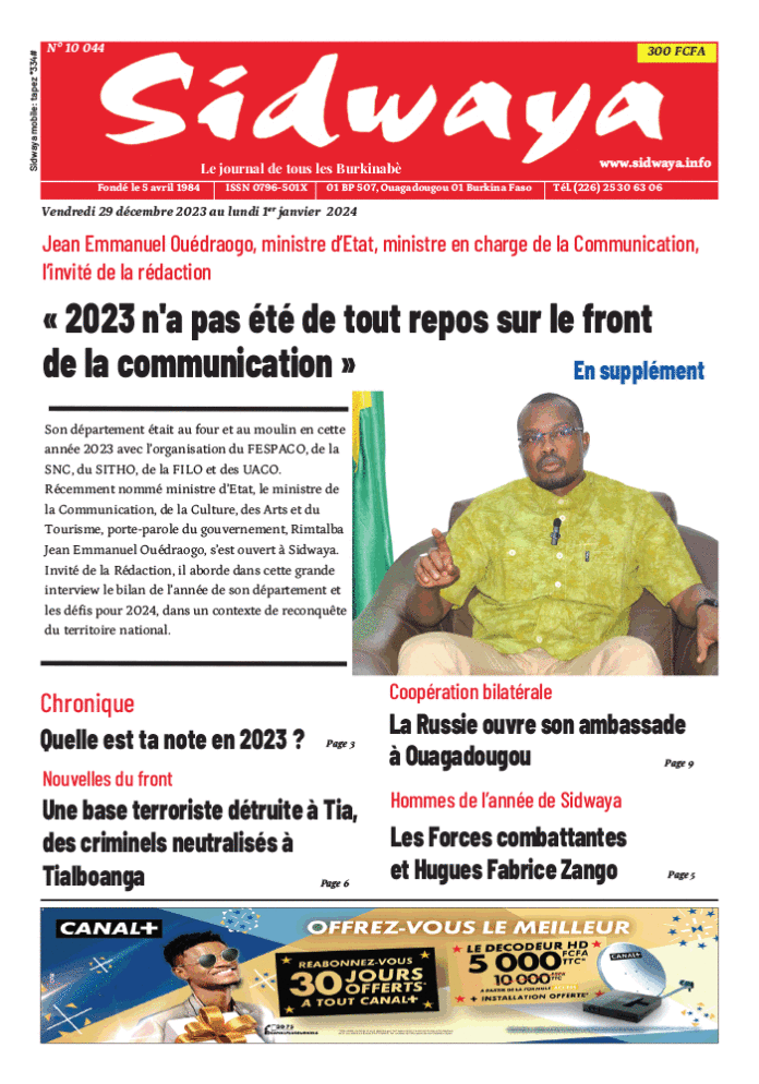 SIDWAYA QUOTIDIEN Une Sidwaya du 29-12-2023 au 01-01-2024 Par JK. Sidwaya - 29 décembre 2023 FacebookTwitterPinterestWhatsAppLinkedinE-mailImprimerTumblrTelegramViberNaver
