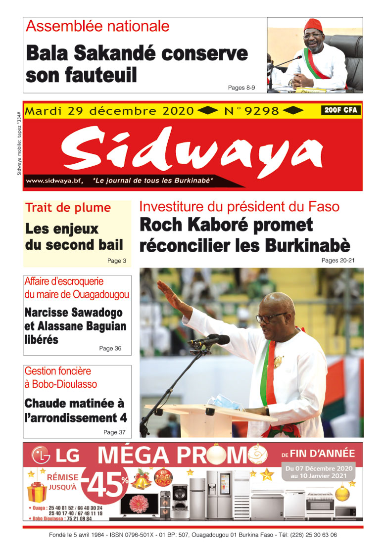 SIDWAYA QUOTIDIEN Une Sidwaya du 29 décembre 2020 Par JK. Sidwaya - 29 décembre 2020 FacebookTwitterPinterestWhatsAppLinkedinE-mailImprimerTumblrTelegramViberNaver