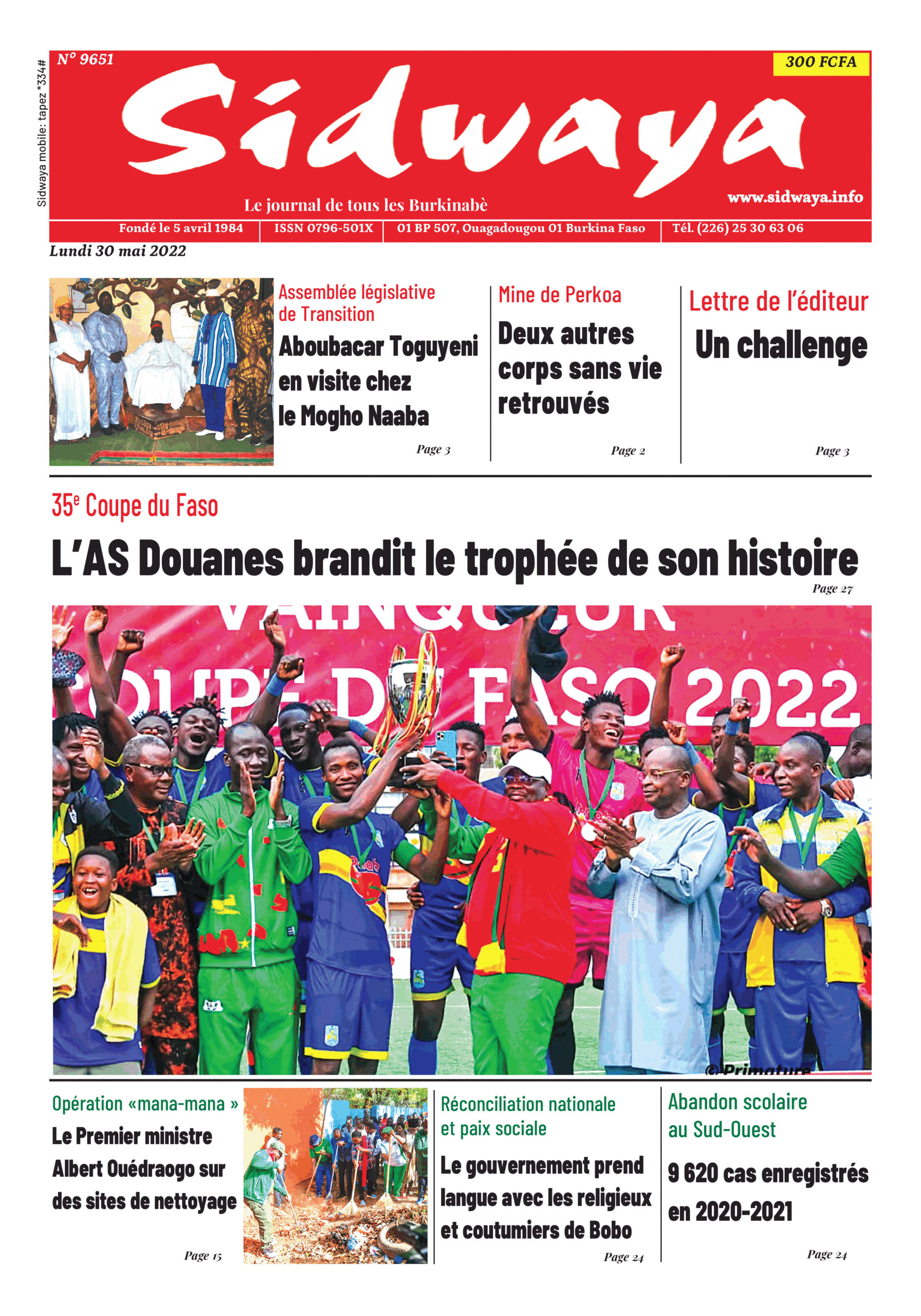 SIDWAYA QUOTIDIEN Une Sidwaya du 30-05-2022 Par JK. Sidwaya - 29 mai 2022 FacebookTwitterPinterestWhatsAppLinkedinE-mailImprimerTumblrTelegramViberNaver