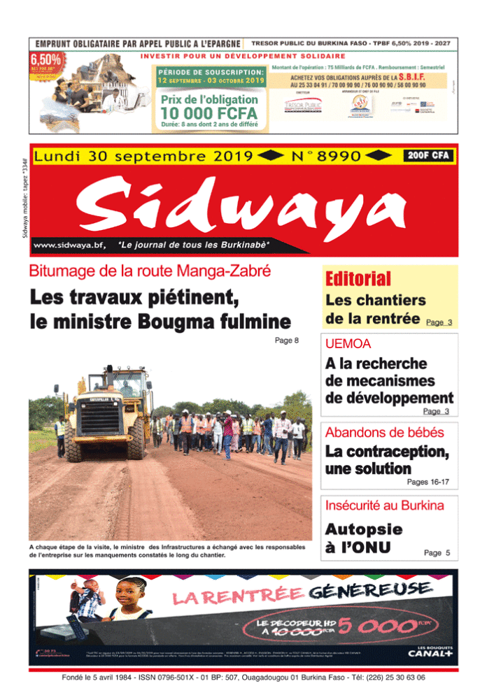 SIDWAYA QUOTIDIEN Une Sidwaya du 30 09 2019 Par JK. Sidwaya - 30 septembre 2019 FacebookTwitterPinterestWhatsAppLinkedinE-mailImprimerTumblrTelegramViberNaver