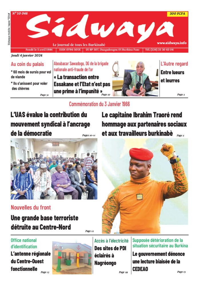 SIDWAYA QUOTIDIEN Une Sidwaya du 4-01-2024 Par JK. Sidwaya - 3 janvier 2024 FacebookTwitterPinterestWhatsAppLinkedinE-mailImprimerTumblrTelegramViberNaver