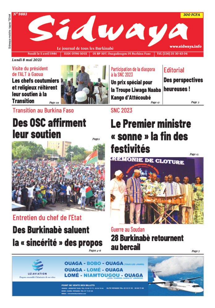 SIDWAYA QUOTIDIEN Une Sidwaya du 5-08-2023 Par JK. Sidwaya - 7 mai 2023 FacebookTwitterPinterestWhatsAppLinkedinE-mailImprimerTumblrTelegramViberNaver