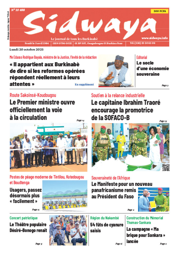 SIDWAYA QUOTIDIEN Une Sidwaya du du 20-10-2025 Par JK. Sidwaya - 19 octobre 2025 FacebookTwitterPinterestWhatsAppLinkedinE-mailImprimerTumblrTelegramViberNaver