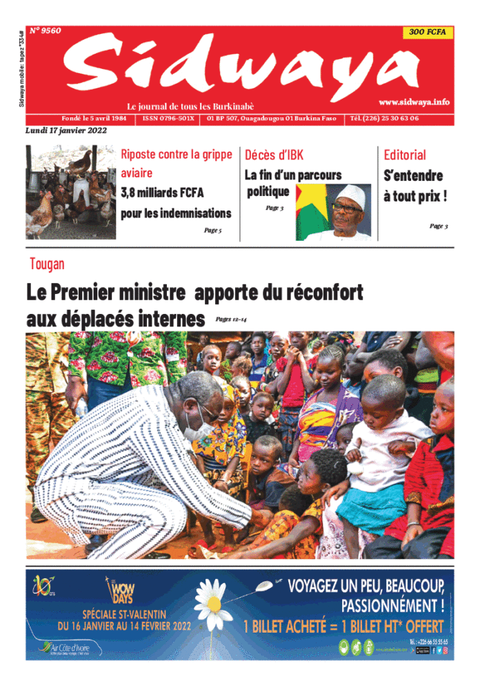 SIDWAYA QUOTIDIEN Une Sidwaya su 17-01-2022 Par JK. Sidwaya - 16 janvier 2022 FacebookTwitterPinterestWhatsAppLinkedinE-mailImprimerTumblrTelegramViberNaver