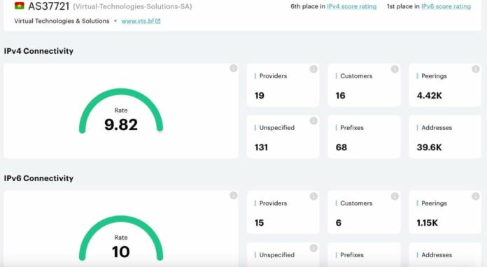 Le Burkina Faso se distingue sur la scène technologique mondiale grâce à Virtual Technologies Solutions SA (VTS-SA), un fournisseur de services Internet qui a réussi l’exploit de positionner le pays en tête du classement mondial de la connectivité IPv6. Cette prouesse technologique met en lumière le potentiel du Burkina Faso en tant que leader dans l’infrastructure Internet, surpassant même des nations traditionnellement en avance sur le plan technologique.
