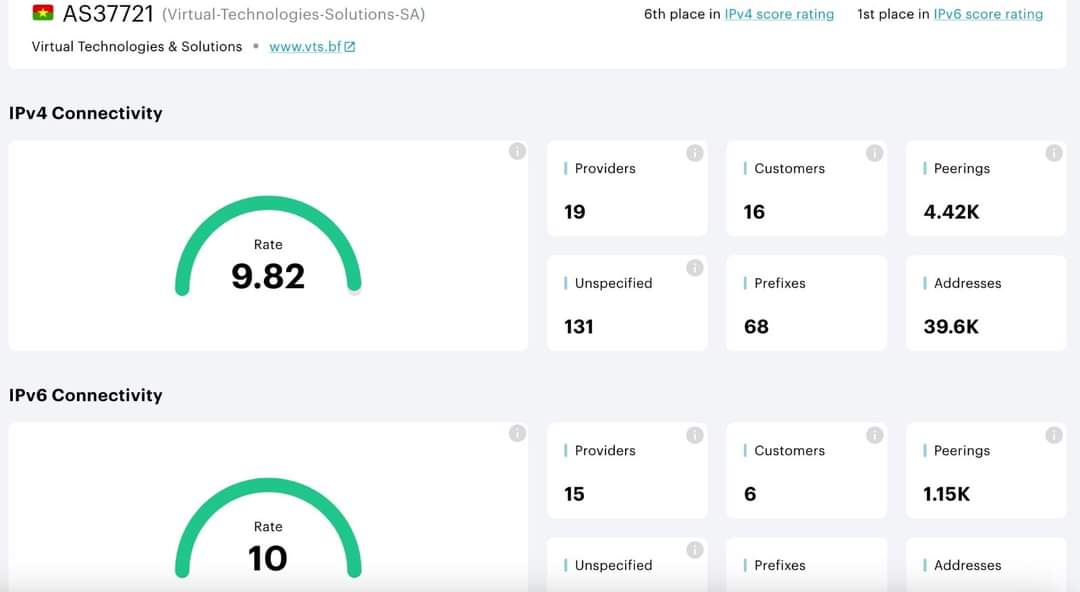 Ce classement repose sur une métrique essentielle : la distance moyenne entre un système autonome (ASN) et les autres systèmes autonomes qui forment l’Internet. Un score élevé sur cette échelle (allant jusqu’à 10) signifie que les utilisateurs de VTS-SA bénéficient d’une connexion directe et rapide avec les grands acteurs du web, tels que Google, Amazon, et Facebook, minimisant ainsi les intermédiaires et optimisant l’expérience en ligne.